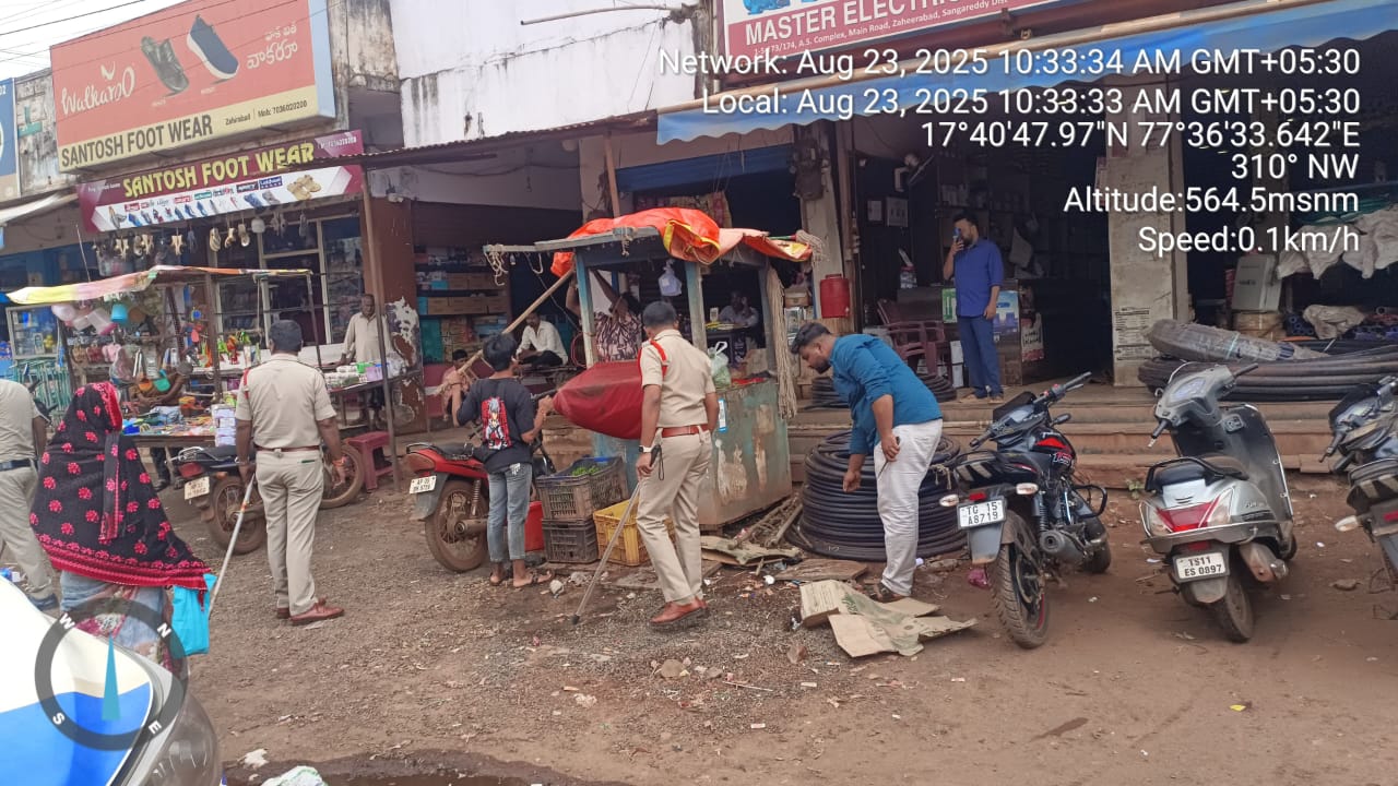 జహీరాబాద్ పట్టణ చుట్టూ ప్రకల గ్రామా ప్రజలకు, వాహనదారులకు, దుకాణా యజమనులకు వ్యాపారులకు పండ్ల కూరగాయల బండ్ల వ్యాపారులకు తెలియజేయునది ఏమనగా, దుకాణం దగర కొనుగోలు చేయడానికి వచ్చిన ప్రజలు తమ తమ వాహనాలను రోడ్ల మిద నిలిపివేయుచున్నారు. పండ్ల, కూరగాయ వ్యాపారులు తమ బండ్ల ని రోడ్ల మిదనే పెట్టి అమ్ముతున్నారు దుకాణా యజమానులు దుకాణా వస్తువులని తమ దుకాణం ముందు రోడ్ల మిద పేటి రోడ్డు ప్రక్కన ఉన్న ప్రదేశాన్ని ఆక్రమించుకుంటున్నారు. ఈ చర్యల వల్ల ట్రాఫిక్ అంతరాయం కలుగుతుంది, అంతేకాకుండా వాహనదారులకి పాదచారులకి రాక పోకలకి ఇబ్బంది ఏర్పడి ప్రమాదాల భారిన పడే అవకాశం ఉంది. అందువల్లన ఈరోజు తేది: 23.08.2025 శనివారం ఉదయం నేను మా సిబ్బంది తో ఎన్ఫోర్స్మెంట్ లో భాగంగా భవాని మందిర్ X రోడ్ నుంచి జహీరాబాద్ బస్టాండ్ వరకు డైవ్ నిర్వహించి ట్రాఫిక్ ని అంతరాయం లేకుండా చేసి, 28 e-challan కేసుల జరిమానా మొత్తం రూపాయలు 20475/-, 3 డ్రంక్ అండ్ డైవ్ కేస్ లు విదించడం జరిగింది. బహిరంగ ప్రదేశాలలో మద్యం సేవించరాదు, మద్యం తాగి వాహనాలను నడుపరాదు ఇది చట్ట రిత్య నేరం. ఇక మీదట ట్రాఫిక్ ను అంతరాయం కలిగించే విదంగా చేసిన వారిపై MV Act Criminal చట్టం ప్రకారం , పోలీస్ అధికారులు తదితరులు పాల్గొన్నారు